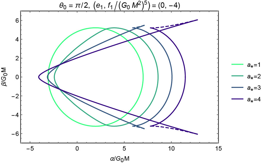 The formation of cusp structures in the shadow critical curves at large angular momentum.